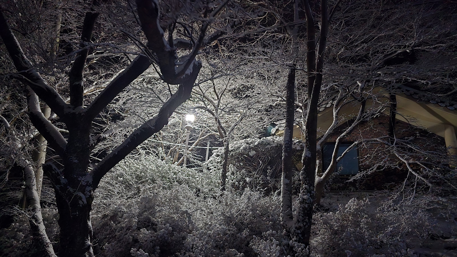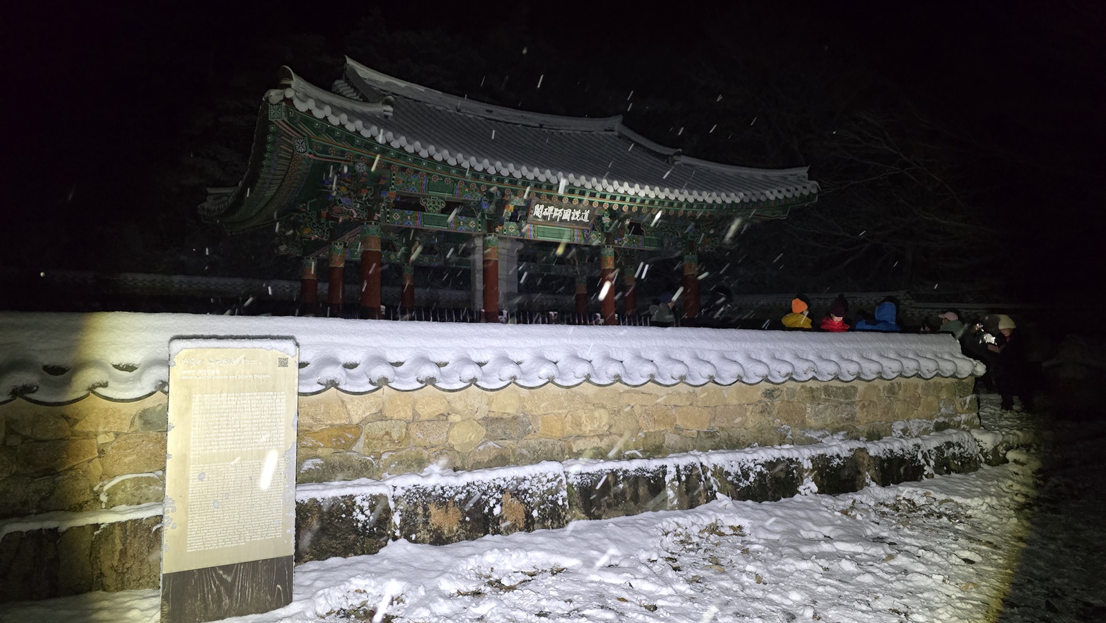 버스에서 하차 도갑사 로 올라가는데 흰눈이 펑펑 내리는 풍경이 컴컴한 아침이지만 눈길을 걸어 올라가는 것도